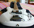 Customisée avec caches micros chromés et pickguard couleur Artic White Fender. Un pickguard noir est également fourni avec. Je mets une housse Tobago avec.